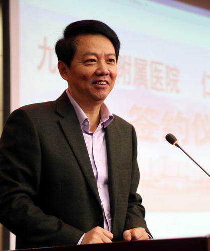 仪式上,校党委书记郑翔发表了热情洋溢的讲话。他说,我到九江学院工作后,经常想一个问题,全国大学有2000多所,新建本科院校有600多所,九江学院如何在短时间里崭露头角,赢得地位?我们党有一个好的传统,就是在敌强我弱的时候,在局部战场上形成优势,最后取得胜利。事情的道理是一样的。那么我校的局部优势要从哪里做起呢?两年前我们首先是抓特色教育,包括好习惯教育、国学素养教育和创业教育;其次是开展抢占学术制高点活动;第三就是柔性引进国内和国际高水平学术团队,与国内外高水平的专家教授合作形成我们的特色和优势。目前学校已经引进了三个高水平学术团队。前不久我们引进了德国音乐艺术家团队,将来有可能把国际声乐大赛引进到九江,之前这是不可想象的。这次我们引进了国际高端乳腺肿瘤一流团队,周永昌教授是亚洲在乳腺肿瘤治疗方面的一把手,Giuseppe Viale教授是欧洲在乳腺肿瘤治疗方面的一把手,还有两名日本著名教授,他们都是国际乳腺肿瘤治疗方面的著名专家。我们选择在局部进行高位嫁接,就有可能在短时间内形成别人也许用20年时间都无法赶上的优势。我们希望引进这个高水平的医疗团队,把九江地区乳腺肿瘤治疗带入一个高水平,希望九江地区兄弟医院的专家学者加入我们这个团队。今天的合作是一个开头,学校将办一个国际医疗算术研究所,目前世界上只有美国的哈佛大学、英国的剑桥大学才有这个研究所,我们是第三个。为了支持这个研究所,学校把南湖校区拿出来给研究所使用,将来以乳腺肿瘤治疗为起点形成我们的优势,这是学校的战略考虑。希望临床医学院/附属医院理解这个战略考虑,支持这个战略考虑,共同把这个研究所办好。
