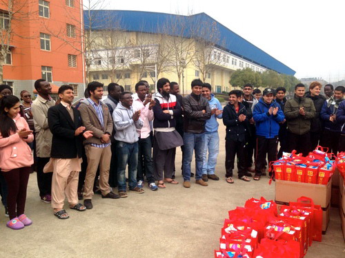 随后,杨耀防副校长代表学校向留学生们送上节日慰问品。收到节日礼物的留学生们兴高采烈,亲身感受到了学校送来的温暖和祝福。