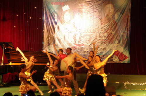 音乐会的帷幕在高瞻带来的京剧反串《霸王别姬》“看大王、劝君王”的选段中被拉开,男声独唱《父亲》、《拉住妈妈的手》在表演者高瞻专业性的演唱技巧中,浓浓的亲情被表现得淋漓尽致,勾起在坐同学们对亲人的思念;本场音乐会形式多样,不仅是歌曲的演唱,钢琴独奏、歌伴舞、长号独奏、铜管五重奏等节目的表演也让观众们耳目一新。还有艺术学院教师蔡圆圆友情助阵,带来钢琴四手联弹,默契的配合宛如只有一人在弹奏。在会场闪烁的灯光下,音乐会的气氛逐渐推向高潮,张彩柳和kofi联手带来的歌舞剧《远方》,好似倾诉了一场忧伤的爱情故事,kofi来自国际交流学院的加纳籍学生,但他对中文歌曲的演唱却毫不逊色,引来在坐观众的雷鸣般的掌声,更有来自国际交流学院的同学们的加油助阵,把音乐会的氛围推向了高潮。
