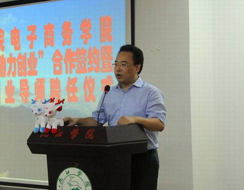 会上,王副校长代表九江学院向各位远道而来参加此次仪式的校友和企业家表示热烈的欢迎和衷心的感谢。王副校长指出,在当今社会经济发展的大趋势下,企业界流行着互联网+、电子商务、O2O、企业转型等关键词,企业“互联网+”正成为未来企业发展的一个趋势。当今时代,企业不注重互联网,不注重电子商务就等于放弃未来。为响应李克强总理提出的“大众创业、万众创新”的号召,九江学院成立了电子商务学院,也是江西省第一个把电子商务独立作为一个学院来发展的学校。学校高度重视电子商务学院的发展和建设,今天,电商学院实行“创业团队培育计划”与企业进行对接是创新创业教育的一大举措,希望各位企业家朋友能与电商学院实现全面的全方位的对接,电商学院要和企业紧密联系,把对接做到实处;企业家为学生实习、实践、创业提供平台和机会,学校为企业提供人力支持和智力服务,双方是相辅相成的。最后祝愿各方同心协力,通力合作,实现共赢。