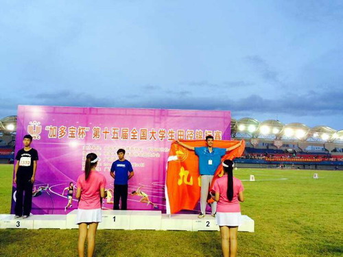 火热的七月,第十五届全国大学生田径锦标赛在广西师大举行,在高手如云的竞争中,我校代表队克服困难,奋力拼搏,黄彬才同学夺得了男子跳高亚军,这是我校有史以来在田径比赛中参加最高级别的、取得最好名次的一次比赛,极大提升了九江学院的知名度。