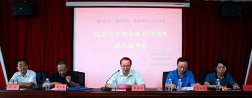 在主题报告上,九江市历史学会名誉会长邓著之教授以《决不能让历史悲剧重演》为题、九江市史志办公室柳秋荣副主任以《九江在全国抗战中的特殊地位》为题、政法学院历史教研室副主任姚建平副教授以《从国家实力看历史中的中日关系》为题做了主题报告。