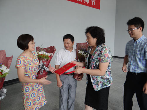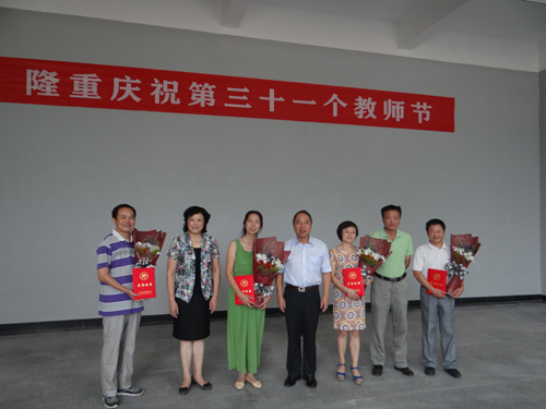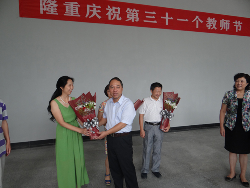 在新落成的教职工活动中心一楼大厅,甘筱青校长等校领导向学校从教三十年以上教师代表颁发了荣誉证书和鲜花,并向他们致以节日的问候。