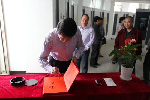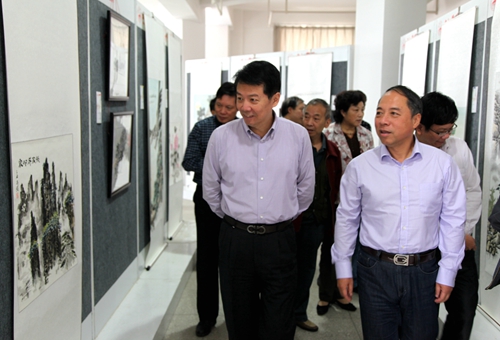 金秋流彩,丹桂飘香。10月9日上午,由校党委宣传部、校工会、离退休职工管理处、艺术学院、老年文学艺术协会联合举办的“纪念抗战胜利七十周年暨国庆六十六周年教职工书画摄影展”在逸夫楼图书馆一楼展览厅正式开展。校领导郑翔、甘筱青、吴桃娥、王万山、魏立平、杨耀防来到展厅,欣赏和观摩教职工的书画摄影优秀作品。
