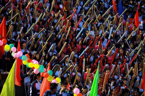 教职工代表队最后入场,全场雀跃欢呼,讲台上他们怀着俯首甘为孺子牛的精神;怀着献身九院传授知识的无私;怀着共创九院美好未来毫无保留的贡献自己的智慧和力量。