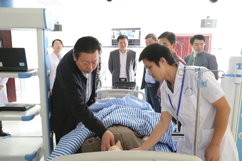 关副主任对临床技能中心六楼数码显微互动实验室、检验综合实验室,四楼模拟产房、儿科基本训练室,三楼中央监控室,二楼模拟ICU、急救技能训练室,一楼外科临床技能实验室、模拟手术室等处进行了重点查看,他对临床技能中心规范的设置、先进的设备给出了极高肯定。见到临床医学院/附属医院极具特色的空姐导诊服务和极具风格的休闲茶吧设置,关副主任十分高兴,称赞临床医学院/附属医院不仅环境面貌一新、硬件配备愈加过硬,在服务患者的举措上也做出了自己的特色,折射出附院在规范化管理和内涵建设上的成绩和效果是“看得见、摸得着”的。