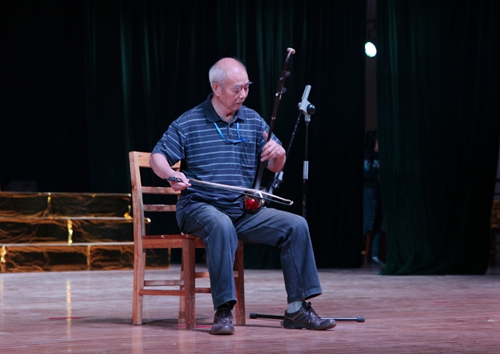 汇演结束后,吴桃娥和相关部门负责同志走上台慰问演职人员,并合影留念。