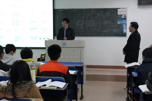 11月11日下午,王万山副校长来到竞知楼702教室,与机材学院A1513/A1571班同学一起听取了胡孔刚老师讲授的《机械制图》课程。机材学院党委副书记陈胜才和副院长王英惠一同听课。