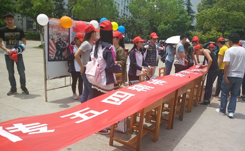 三是把开展纪念“五四”运动97周年系列活动与线上活动相结合。按照团省委的统一部署,我校在五四前夕开通了“青年之声”互动社交平台,发挥团属微博、微信等新媒体平台作用,开设了“五四”活动专栏,开展编创转发、微话题讨论、微访谈等活动,推出了“五四”网络新媒体文化产品等,传递了“青年好声音”,吸引了近3000名青年学生参与互动。线下开展了第二期“青年之声·青年午餐会”活动,王万山副校长和同学们共进午餐,零距离听取青年心声。部分二级学院还结合实际,广泛开展了青年座谈会、中华优秀传统文化进课堂、红五月、千人国学诵读、书画摄影比赛等富有思想内涵、形式多样的“五四”节日文化活动,鲜明地亮出团旗、团徽、团歌等共青团的文化标志,努力开展了符合时代特点、富含时尚元素、青年广泛参与、深入青年欢迎的“五四”节日文化,丰富了青少年文化生活。