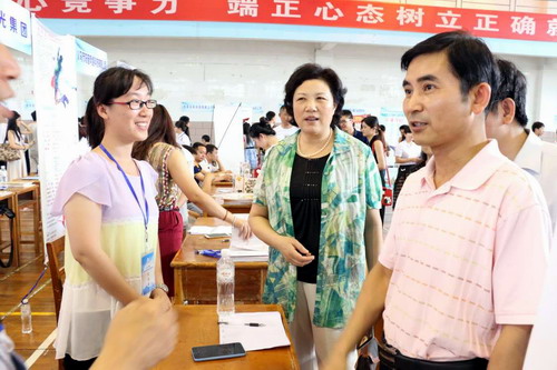 就业洽谈会期间,副校长吴桃娥、纪岗昌、王万山、校纪委书记魏立平在招生与就业处处长肖国丰、副处长罗双凤等的陪同下,逐一到各企业、单位的招聘点与各企业、单位的负责人进行交流和慰问。