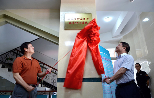 在住院部一楼大厅,两院领导共同为达成技术协作医院合作揭牌。随后,一行人到放疗科和治疗室进行参观,了解临床医学院/附属医院直线加速器以及放疗科建设情况。