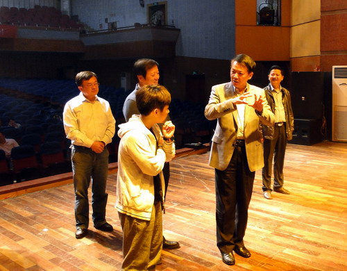 每到一个校区,郑书记都认真地观看了整个排练过程,郑书记一边仔细聆听了同学们的演唱,一边根据音乐的节律打着节拍。在排练的间隙,郑书记走上主席台排练现场,向同学们表示亲切的慰问,并和排练的指导老师探讨排练的相关细节,指出演唱中的某些需要强调和修正的地方。