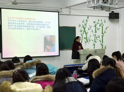 课堂上,廖晓春老师理论联系实际对《老年护理学》进行细致讲解,教态自然,语速适中,条理清晰。