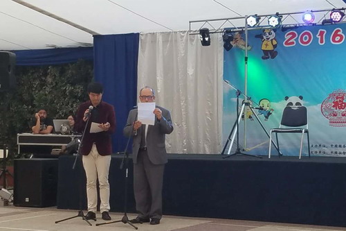 智利当地时间2016年12月14日晚7点30分,由国务院侨务办公室和中国海外交流协会主办、江西省外事侨务办公室和智利北京海外联合会承办、江西省九江学院和江西理工大学具体协办的2016“中华文化大乐园—智利圣地亚哥营”开营仪式在智利圣地亚哥(San Diego)隆重举行,国务院侨务办公室文化司司长雷振刚、中国驻智利大使李宝荣、文化参赞贺踊、商务参赞刘如涛、中国驻智利领事馆副领事于鹏、国侨办文化司华文教育处处长王梦黎、新华社智利分社社长冷彤、智利北京海外联合会会长关金涛、智利中文学校校长Tomas Montecinos Soto、江西省外侨办人事处调研员即江西教师团带队团长周江、旅智各社团和商会的各位侨领们等,以及此次报名参加中华文化大乐园活动的海外华裔青少年一百余人参加此次开营仪式。