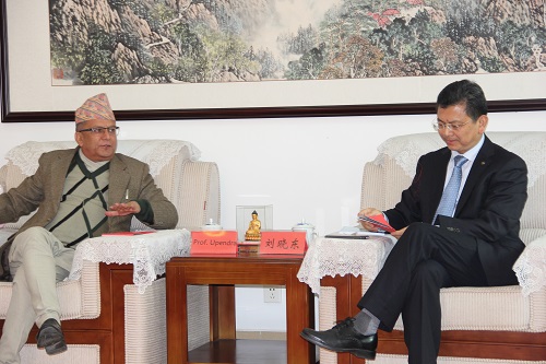 刘晓东校长代表全校师生热烈欢迎尼泊尔中西部大学吴鹏德校长此次来访,他简要介绍了九江学院基本情况,并认真听取了尼泊尔中西部大学校方的来访目的和真诚愿望。他希望借此契机促成两校间在医学教育等多领域的合作交流,同时向对方院校积极寻求与我校共建孔子学院的意愿和努力表示感谢,他表示因我校已经承办了两所孔子学院,故申请再次承办孔子学院国家汉办可能会有所限制,报批可能会有一定难度,但我校会积极探索其他途径和方式开展与尼泊尔中西部大学在各方面的教育合作交流,实现双方优势互补。他表示,中尼两国睦邻友好,中国政府又积极推进“一带一路”战略,作为“一带一路”沿线国家,中尼院校间有着非常良好的合作基础和广阔的发展前景,他希望九江学院和尼泊尔中西部大学能够共同合作,从启动医学教育项目着手,还可围绕汉语国际教育、师生交换和尼泊尔学生读研项目等展开其它多领域的合作与交流。