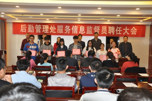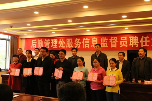 为了进一步完善后勤服务工作体系,搭建师生参与后勤各项服务工作平台,提高服务水平和质量。4月26日下午,后勤管理处在濂溪宾馆二楼会议室召开服务信息监督员聘任大会,副校长杨耀防出席会议并讲话,后勤管理处副科以上干部和全体信息监督员60余人参加会议,会议由后勤管理处党委书记张红涛主持。