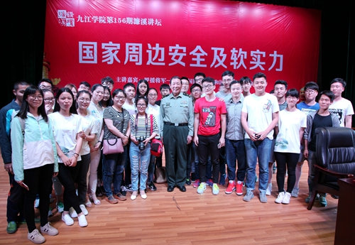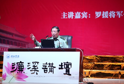 罗援将军的报告不仅是一堂份量厚重的国防教育课,更是一堂饱含深情的爱国主义的教育课,报告强调要大力弘扬民族精神,弘扬爱国主义,要坚决捍卫主权,坚决维护祖国统一,构筑民族精神和爱国主义的钢铁长城。使在场听众进一步认清了当前国防形势和周边动态,增强了国防观念和忧患意识。报告结束后,罗援将军还与现场师生进行了互动,回答了师生提出的问题。罗援将军还为我校濂溪讲坛题词:“与九江学院师生共勉:精忠报国”。