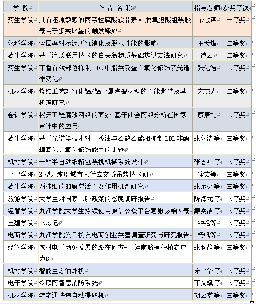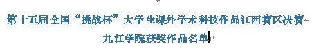 6月4日,由共青团江西省委、江西省科学技术协会、江西省教育厅、江西省社会科学院、江西省学生联合会共同主办的2017年第十五届“挑战杯”全国大学生课外学术科技作品竞赛江西赛区终审决赛在华东交通大学落下帷幕。共有来自全省70所高校的332件作品进入终审决赛。经过激烈角逐,我校最终获得一等奖1项、二等奖5项、三等奖12项,先进个人1名,学校获得本科组“优秀组织奖”。