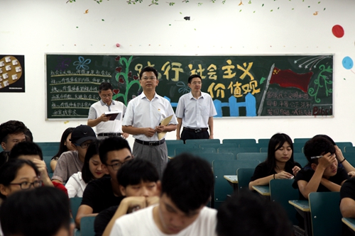 校党委书记赵伟、校党委副书记魏立平来到艺术学院教学楼检查第一课情况。赵书记、魏副书记一行从一楼到五楼一间一间教室开始检查,不时与陪同检查的教务处和艺术学院领导交流教学、科研和人才引进事宜。当发现有一间教室没有打扫干净时,赵书记要求艺术学院及时清扫,使学生养成良好的卫生习惯。赵书记一行还随堂短暂听取了艺术学院王春生书记主讲的书法课。赵书记对师生一开学就能以饱满的精神状态投入到教学和学习中去很满意,希望大家再接再厉,继续保持这种良好的工作和学习势头。