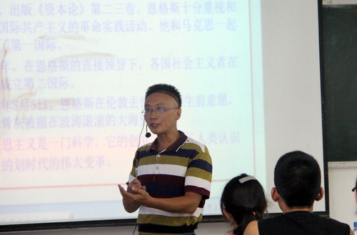 胡盛弦老师本节授课内容为第一专题《实事求是思想路线与马克思主义中国化两大理论成果》。结合经管专业特点,利用视频课件,胡盛弦老师深入浅出地讲解了“马克思主义中国化”的提出及内涵,在授课过程中,不时与学生互动交流。刘晓东校长在听课过程中不时关注着学生动态,并认真做着听课记录。