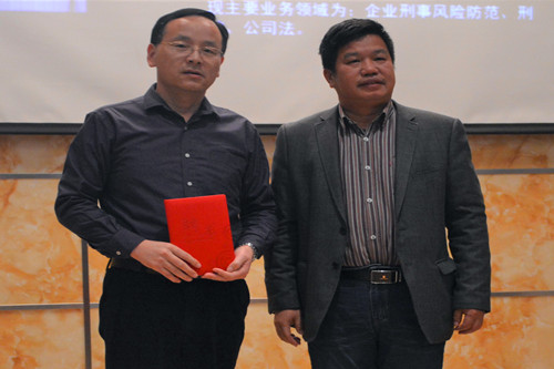 讲座前,举行了简短的聘任仪式,政法学院特聘余尘博士为客座教授,陈春生副校长为其颁发了聘任证书。