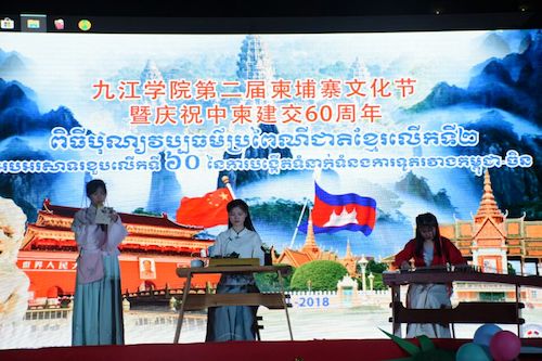 每年公历4月14至16日是柬埔寨最隆重的节日——宋干节,也是柬埔寨传统新年。2018年是中柬建交60周年,4月15至16日,九江学院柬埔寨研究中心、校团委、国际交流学院共同筹备组织了“九江学院第二届柬埔寨文化节暨庆祝中柬建交六十周年”一系列庆祝活动。活动主要包括开幕式、柬埔寨传统祈福仪式、柬埔寨特色风情展示、中柬建交60周年成就展、柬埔寨美食品鉴、“庆祝中柬建交流六十周年”晚会、中柬青年学者对话会、柬埔寨文化访谈等。