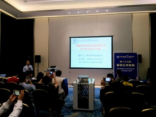 8日上午,在中文核心期刊《化学教育》主编、北京师范大学刘正平教授的主持下,曹小华教授并做了主题为“硫酸亚铁铵制备实验多维互动教学模式探索与实践”的口头报告。报告依次从“提出问题:模式简介及教学现状”、“解决问题:多维互动教学模式实践”、“解决效果:两种模式的比较”三个层面进行讲解,并对课题组主持的省教改重点课题系列相关成果进行了推介。