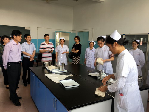 汇报会结束后,督查组一行实地走访了基础护理实验室、健康评估实验室、手术室等五个实验室,认真听取讲解员讲解,现场观摩了2015级护理本科班实习前强化训练课程。随后,督查组进入护理学院评估资料室随机抽查了教师工作手册、试卷及教案讲稿等材料。杨耀防副校长还提前深入护理学院教室查看了师生课堂教学情况,重点听了邹敏老师的课并给予高度评价。