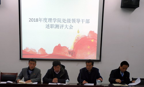1月2日上午,理学院在文友楼三楼会议室召开了2018年度院领导班子和处级干部述职测评大会。副校长陈春生,校党委委员、党办主任、统战部长刘遵海,党院办综合科倪玉平出席了会议,理学院全体教师参加了会议。会议由刘遵海主持。