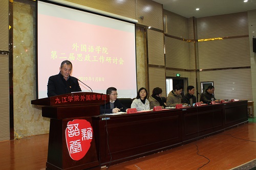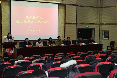 为进一步贯彻落实《全国高校思想政治工作质量提升工程实施纲要》的文件精神,统筹谋划新形式下大学生思想政治工作,推进我院思政工作的针对性与实效性,1月8日上午,外国语学院召开第二届思政工作研讨会,副校长查振华到会出席会议并讲话。校工会主席、组织人事部副部长金葆金及外语学院全体教师参加会议,会议由韩琨院长主持。