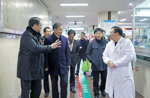 在门诊及住院部,校领导与医护人员亲切握手。虽然临近春节,医院患者却持续爆满,工作量较往年大大增加,医务人员每天都加班加点,经常忙得连吃饭都顾不上。赵书记关切地说,广大医护人员坚守在一线,辛勤付出,我们代表学校向大家表示感谢和慰问,希望大家在欢度春节的同时,确保医疗安全,为患者做好服务服,为全市人民的生命健康保驾护航。赵伟书记还强调要进一步加快推进新大楼建设,倒排时间节点,争取早日完工投入使用,全面提升服务能力。