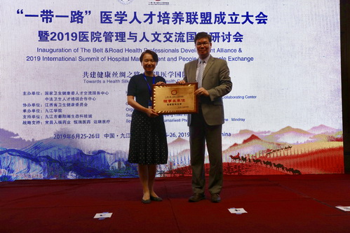 为贯彻落实国务院相关文件精神,6月25日,由国家卫生健康委人才交流服务中心和中法卫生人才健康委员会共同主办,江西省卫生健康委员会协办,九江学院承办的“一带一路”医学人才培养联盟成立大会暨2019医院管理与人文交流国际研讨会在九江市召开。