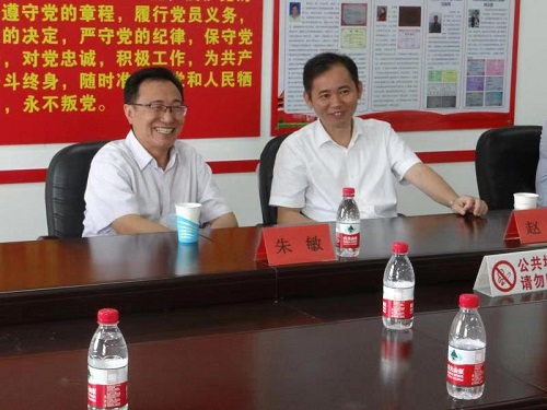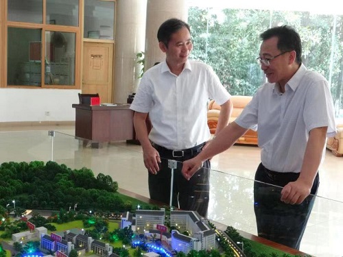 在行政楼大厅,朱敏副校长认真观看了我校新校区沙盘模型。赵伟向朱敏副校长详细介绍了我校校区资源整合项目有关情况。