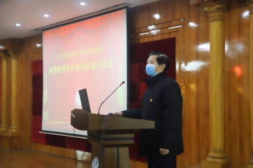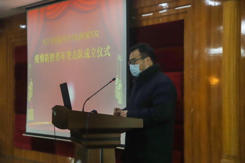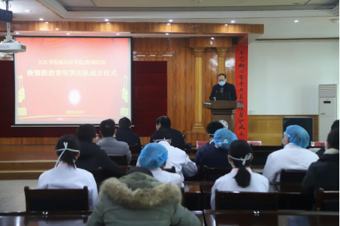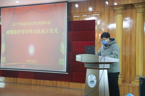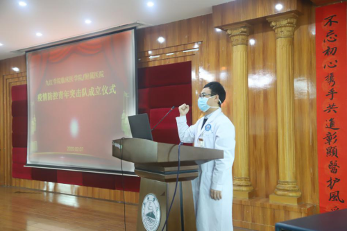 附属医院党委副书记、副院长殷小平同志宣读了《九江学院临床医学院/附属医院关于成立疫情防控青年突击队决定》,他要求各突击队干部要勇挑重担,树标杆、做榜样,广大青年要响应组织号召,勇担重担,打赢疫情防控阻击战战斗。