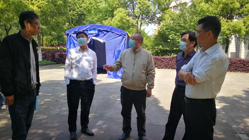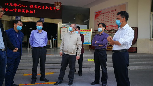 4月27日上午,刘晓东校长在主校区考察复学防疫准备工作,副校长杨耀防、夏启国、陈小林陪同,党院办、宣传部、保卫处、后勤管理处、学生处、校医院等部门负责人参加。