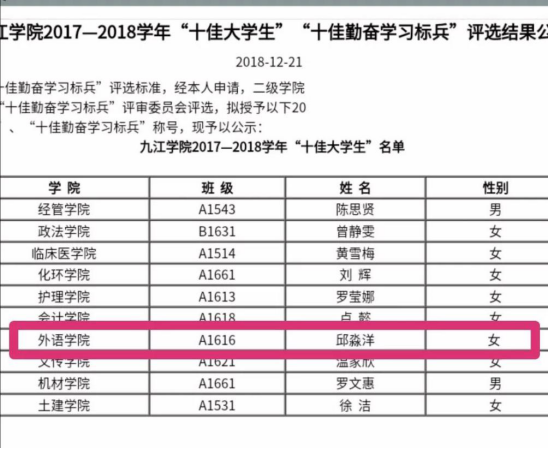 她是班级和专业双第一的学霸,是九江学院国旗班的一员。她在各种比赛上荣获了不少奖项,更在今年的考研中成功“上岸”,被苏州大 学录取。榜样离我们很近,模范在我们身边。快来一起看看,九江学院2019年度“大学生年度人物”邱淼洋有着怎样的故事吧。