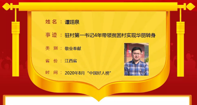 10月27日,中央文明办发布2020年8月—9月中国好人榜名单。武宁县官莲乡东山村驻村第一书记、村党支部书记谭翊泉荣登榜单。