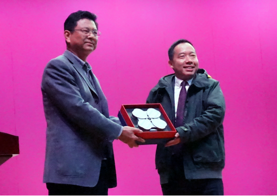 讲座结束后,时煌军与同学们进行了互动,回答了同学们的问题,向学校赠送了进博会标识模型。他还欣然为濂溪讲坛题辞:新时代,共享未来。