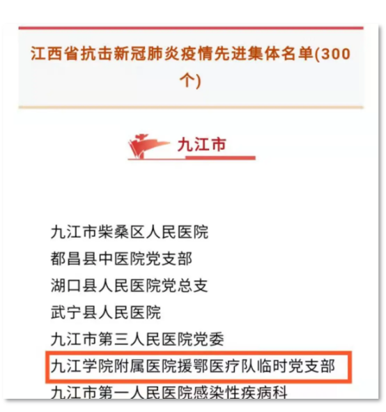 近日,中共江西省委、江西省人民政府作出关于表彰江西省抗击新冠肺炎疫情先进个人和先进集体组织的决定。我校附属医院援鄂医疗队临时党支部获得“江西省抗击新冠肺炎疫情先进集体”和“全省先进基层党组织”称号。我校附属医院副院长、主任医师胡志坚,附属医院急诊科主任、副主任医师但传军,附属医院消化内科副主任、主任医师王细金,附属医院重症医学科副主任、主任医师喻秋平分别获得“江西省抗击新冠肺炎疫情先进个人”称号。