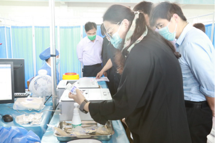 中午12:00 ,工作组一行来到我校临时疫苗接种点南区训练馆。在简单听取我校及濂溪区相关负责同志汇报接种点情况后,专家们实地查看了我校新冠病毒疫苗接种工作流程、接种场地分区设置、疫苗管理、疑似异常反应的监测、处置以及救治药品、设备等情况,并现场询问医务人员关于疫苗接种服务情况。
