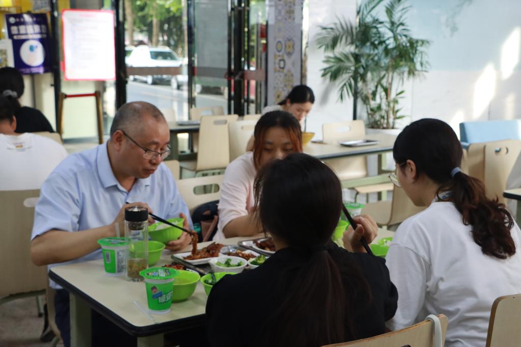 团日活动结束后,陈小林与该班同学一同前往学生一食堂共进晚餐,体验学生食堂生活,倾听学生心声。“同学们的学习生活有什么不方便的地方吗?”“你们觉得学校还有哪些工作需要改进?”“大家对未来的职业规划是怎样的?”他细心地关注身边围坐的每一位同学,了解大家的学习情况、生活情况、职业规划等。细致入微的询问,让在座的每一位学生都倍感温暖。