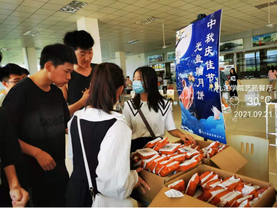 9月18日的教工食堂和9月21日的学生食堂,人头攒动,格外热闹,不少师生很快吃光了盘中餐,在餐具回收点,他们手拿“光盘”换得一块月饼,月饼是九江学院专属的“校徽”月饼。每一块都印着九院校徽,有蛋黄莲蓉、五仁、豆沙等口味,温情满满。师生们换得“校徽”月饼后,惊喜不已,迫不及待地拍照、发朋友圈。他们说,月饼很精美,很有纪念价值,都舍不得吃了。