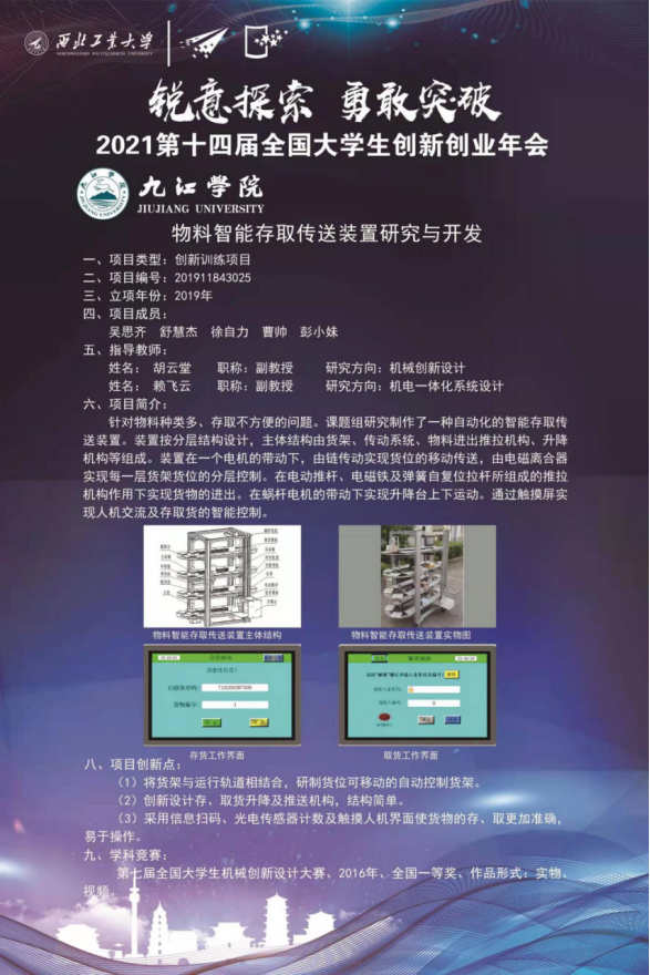 此外,我校还在本届大赛中取得了另两项首次突破,机械与智能制造学院由吴思齐、舒慧杰、徐自力、曹帅、彭小妹五名同学负责和胡云堂、赖飞云两位老师指导的《物料智能存取传送装置研究与开发》项目入选第十四届全国大学生创新创业年会改革成果展示项目(全省共9项);创新创业学院负责人宋士华成功入选中国国际“互联网+”大学生创新创业大赛入库评审专家。