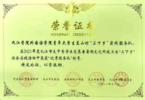 我校各二级学院积极开展“唱响红色经典,凝聚奋进力量”“红色走读”活动,教育引导广大青年学生坚定理想信念,自觉争当红色基因的传承者、实践者。近日,省委教育工委、省教育厅组织开展的全省高校“红色走读”活动获奖名单公布,我校多个团队取得优异成绩,荣获“实地走读成果”一等奖1个、二等奖1个、三等奖3个;荣获“讲述发生在江西红土地上的党史故事比赛”三等奖4个。各二级学院开展“三下乡”暑期学生社会实践活动,其中,外国语学院青年大学生赴东山村“三下乡”实践服务队被评为九江市大中专学生志愿者暑期文化科技卫生“三下乡”社会实践活动优秀服务队,文学与传媒学院三下乡服务队喜获2021年度九江市大中专学生志愿者暑期文化科技卫生“三下乡”社会实践活动优秀服务队、2021年度九江学院暑期文化科技卫生“三下乡”社会实践活动优秀服务队荣誉称号。
