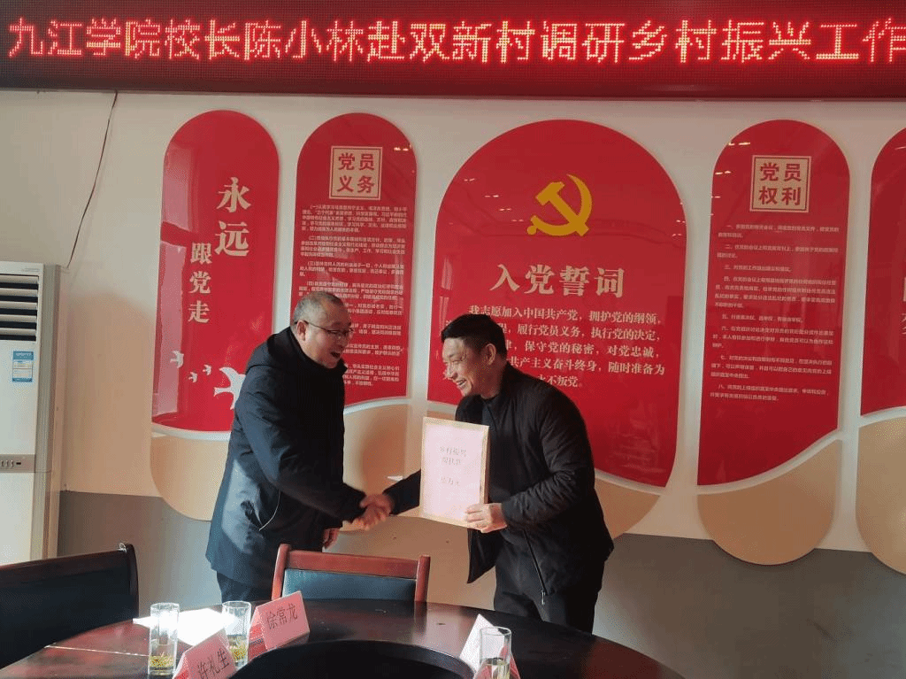 随后,陈小林围绕学校定点帮扶双新村谈了想法。他指出,九江学院高度重视对双新村的对口支援工作,力争做到全校动员、全面支持。自从7月20日学校驻村工作队入驻双新村起,全校各职能部门、二级学院积极做好对口帮扶工作,取得了初步的成效。下一步,我们将继续和双新村一起努力,争取调动各方资源和力量,让双新村产业更加兴旺、乡风更加文明,努力增加老百姓的获得感和幸福感。希望通过帮扶和各方努力帮助双新村建成乡村振兴示范点,谱写乡村振兴的新篇章。