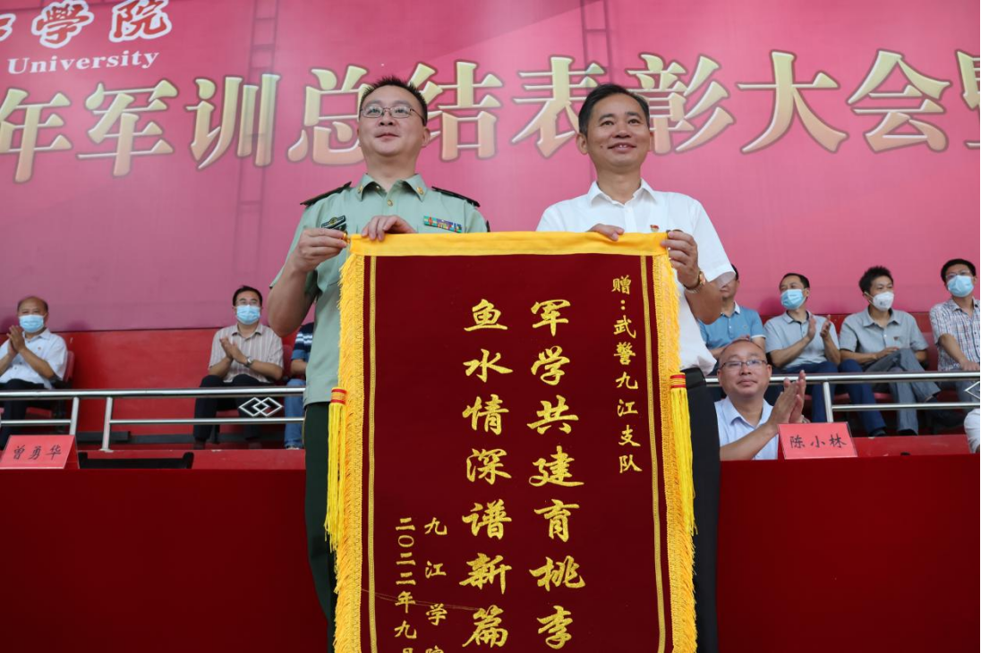 学校领导、武警九江支队领导给获奖连队颁发锦旗