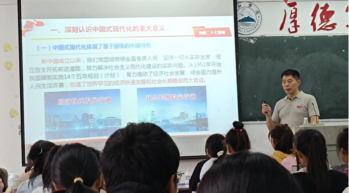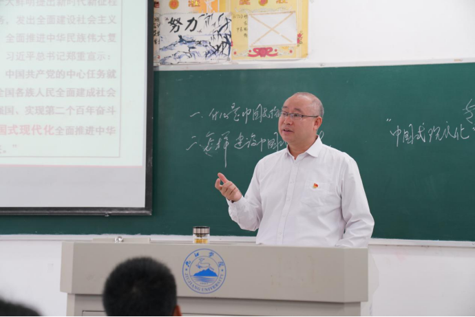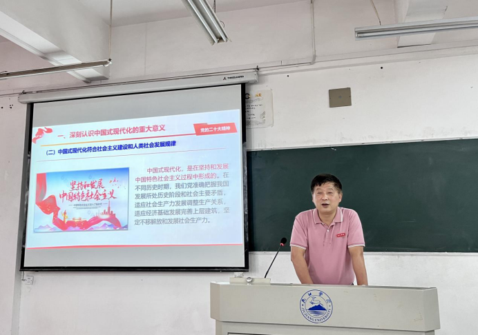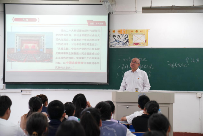 李明斌在授课时指出,党的二十大鲜明提出新时代新征程党的使命任务,发出全面建设社会主义现代化国家、全面推进中华民族伟大复兴的动员令。同学们要深刻认识党的二十大精神的历史性、划时代、里程碑意义;要深刻认识中国式现代化的中国特色、本质要求和重大意义。李明斌勉励2023级新同学把个人追求与民族复兴的责任担当紧密相连,把个人理想融入时代主题、汇入复兴伟业,自觉承担起自己的历史使命和时代责任,以勤奋学习为青春远航的动力,让增长本领成为青春搏击的能量,切实以优异成绩“让青春在全面建设社会主义现代化国家的火热实践中绽放绚丽之花”。