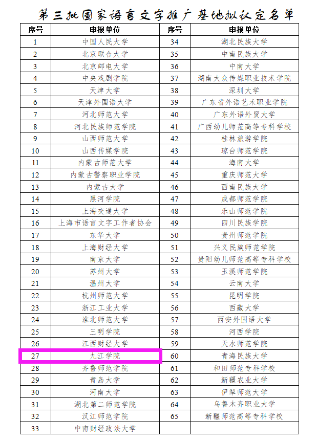 近日,国家语委公示第三批国家语言文字推广基地名单,全国共65家单位入选,九江学院成功入选。