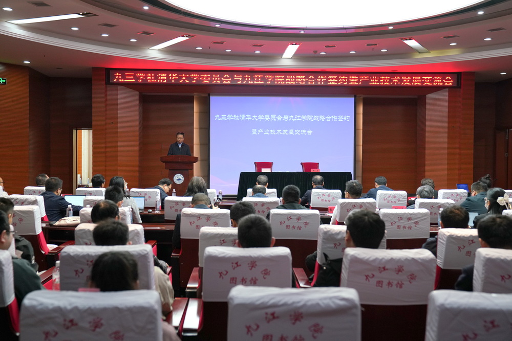4月9日上午,九三学社清华大学委员会与九江学院战略合作签约暨产业技术发展交流会在学校逸夫图书馆报告厅举行。九三学社北京市委员会专职副主委左小兵,九三学社北京市委员会副主委、清华大学委员会主委韩敏芳,九三学社江西省委员会专职副主委肖礼庆,九江市委常委、统战部部长章剑飞,九江市政协副主席、九三学社九江市委员会主席周杏连,九江学院党委书记李明斌出席会议。来自九三学社清华大学委员会的专家教授,九江市委统战部、工信局、绿发中心、贸促会、商务局、科技局等单位的负责同志等参加会议。会议由九江学院副校长严平主持。