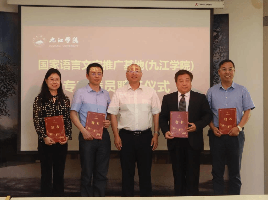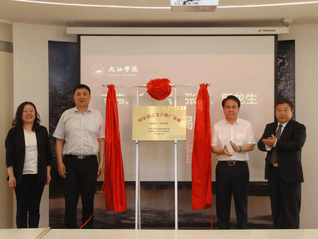5月24日,国家语言文字推广基地(九江学院)揭牌仪式暨语言文字工作创新研讨会在九江学院丹枫园举行。江西省教育厅二级巡视员李伟,九江学院党委书记李明斌,党委副书记、校长、国家语言文字推广基地(九江学院)主任陈小林,副校长王万山、严平,副校长、国家语言文字推广基地(九江学院)副主任李松志,江西省教育厅语言文字工作与教材处处长、省语言文字工作委员会办公室主任张婵,教育部语言文字应用研究所郭龙生研究员,同济大学国际文化交流学院院长、国家语言文字推广基地(同济大学)常务副主任孙宜学教授,湖南大学中国语言文学学院学科带头人、国家语言文字推广基地(湖南大学)首席专家刘文正教授,江西省语言学会会长、国家语言文字推广基地(江西师范大学)副主任刘楚群教授,江西省语言学会副会长、国家语言文字推广基地(南昌大学)副主任付欣晴教授出席揭牌仪式和语言文字工作创新研讨会,九江学院相关部门负责人及师生代表等参加活动。李松志主持揭牌仪式。